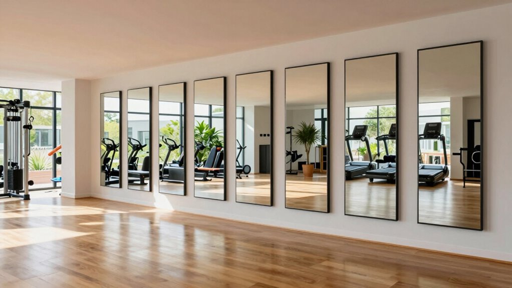 The mounting options you choose can considerably impact both the safety and functionality of your workout room mirror. Wall-mounted mirrors can be secured with screws, anchors, or adhesive strips, depending on your wall type and weight support. This guarantees stability during workouts. Alternatively, freestanding mirrors with stands or wheels offer portability and flexibility, making it easy to move or reposition as needed. Some mirrors provide versatile mounting methods, allowing you to switch between wall-mounted and freestanding setups, which adds convenience. It’s vital to match the mounting hardware’s strength to the mirror’s size and weight for safety. Proper installation on flat, sturdy surfaces minimizes distortions and enhances durability, ensuring your mirror stays secure and functional throughout your fitness routines.
