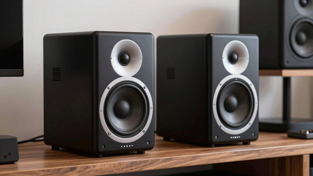 Achieving excellent sound quality in powered bookshelf speakers under $1000 requires paying attention to several key factors. Look for speakers that deliver clear, balanced audio with well-defined bass, mids, and highs. High-quality drivers, such as 3-inch or larger woofers and silk dome tweeters, are essential for detailed and immersive sound. Check the frequency response range; wider ranges like 47 Hz to 30 kHz typically indicate better reproduction. Impedance and power handling ratings also matter—higher power capacity, around 100W or more, ensures louder, distortion-free audio. Finally, your preferred sound profile should match your listening style, whether warm and natural or bright and detailed, often influenced by enclosure design and driver quality. Prioritizing these factors will help you find speakers that truly satisfy your sound quality expectations.