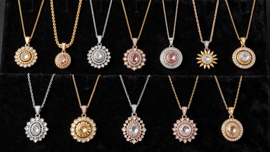 Choosing the right statement necklace set for a formal event hinges considerably on the quality of its materials. I always look for jewelry made from hypoallergenic alloys and plated metals, which guarantee durability and minimize skin irritation. Genuine gemstones or high-grade rhinestones instantly elevate the set’s elegance and perceived value. Metal plating, like 18K gold or platinum, not only gives a luxurious look but also resists tarnishing and corrosion over time. It’s essential to select materials free from nickel, lead, and other harmful substances, especially if I have sensitive skin. I also prioritize well-crafted components, such as reinforced clasps and secure settings, to assure the jewelry’s longevity and reliable performance. High-quality materials make all the difference in ensuring my statement necklace looks stunning and lasts through any formal occasion.